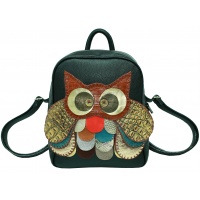 Rucsac realizat manual, din piele naturala, cu aplicatie in forma de bufnita ,cusuta manual(tot din piele). Rucsacul este intarit cu salpa, este captusit cu satin(print cu bufnite), este compartimentat, are un buzunar cu fermoar in interior precum si unul pe exterior, pe spate. Dimensiuni: 32cm/25cm. Produs unicat, made in Romania.