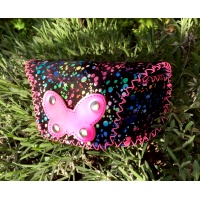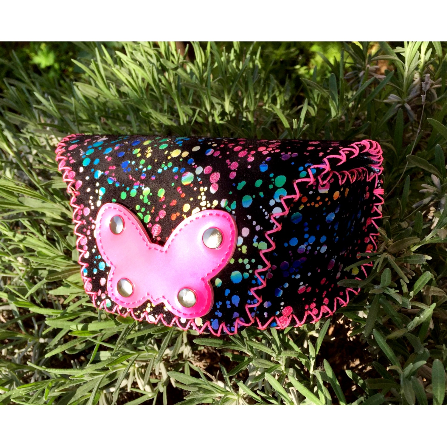 Colorful Printed Black Camoscio Leather with a hot pink butterfly Sunglasses Handsewn Case