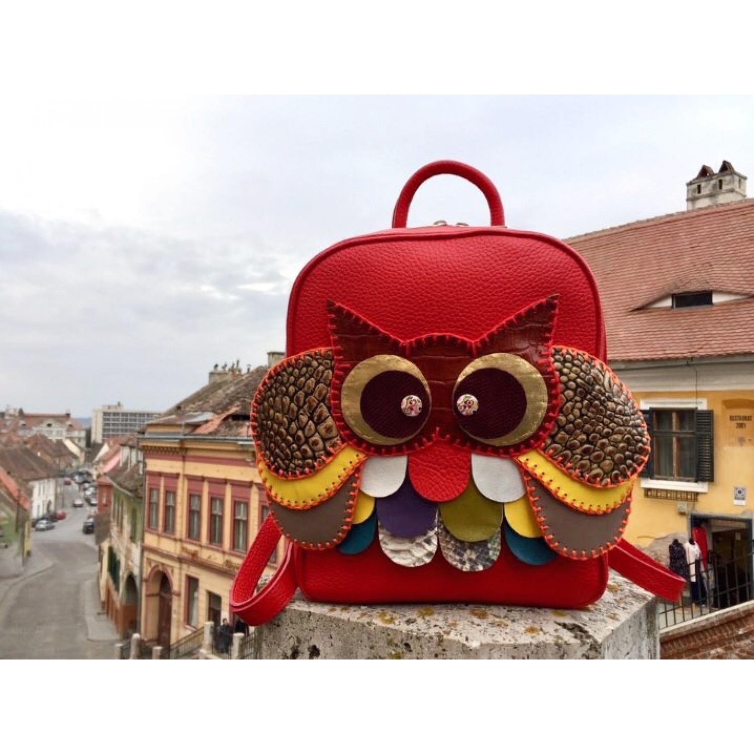 Rucsac realizat din piele naturala, cu aplicatie in forma de bufnita ,cusuta manual(tot din piele). Rucsacul este intarit cu salpa, este captusit cu satin, este compartimentat, are un buzunar cu fermoar in interior precum si unul pe exterior, pe spate. Dimensiuni: 32cm/25cm. este perfect pentru a fi oferit ca si cadou unei persoane dragi.Produs unicat, made in Romania.