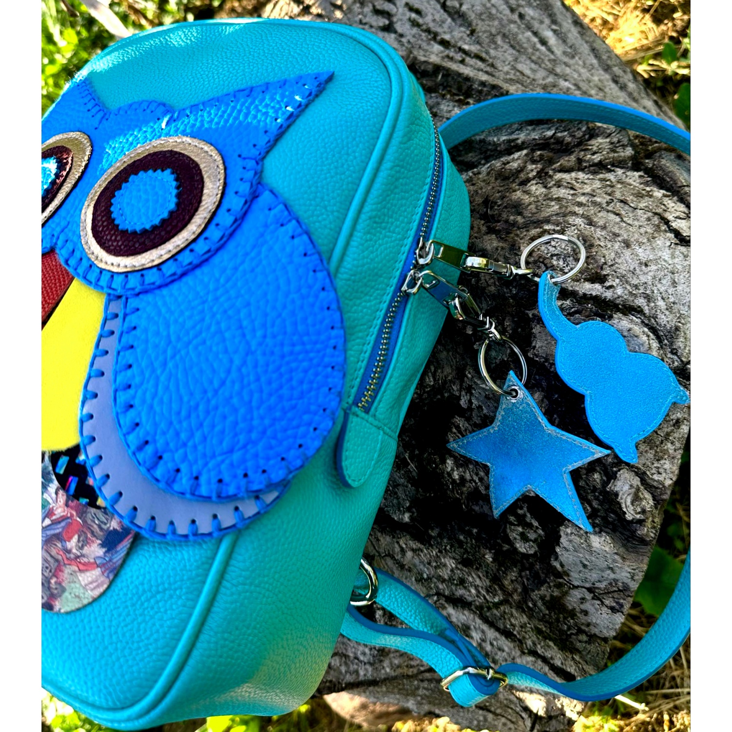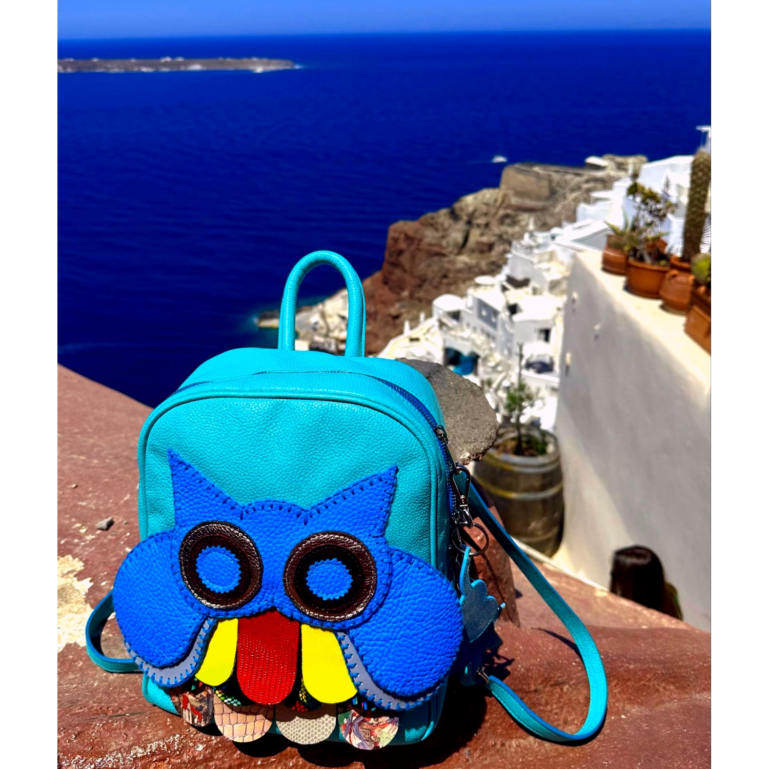 Rucsac realizat din piele naturala bizonata, cu aplicatie in forma de bufnita ,cusuta manual(tot din piele). Rucsacul este intarit cu salpa, este captusit cu satin, este compartimentat, are un buzunar cu fermoar in interior precum si unul pe exterior, pe spate. Dimensiuni: 32cm/25cm. este perfect pentru a fi oferit ca si cadou unei persoane dragi.Produs unicat, made in Romania.
