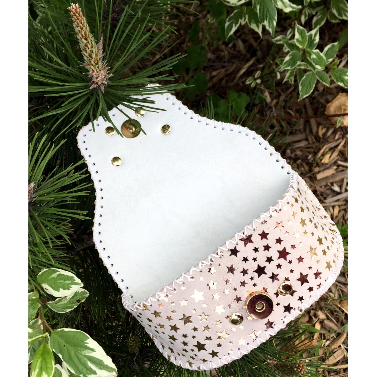 Metallic Gold Stars Printed on White Suede Leather Sunglasses Handsewn Case