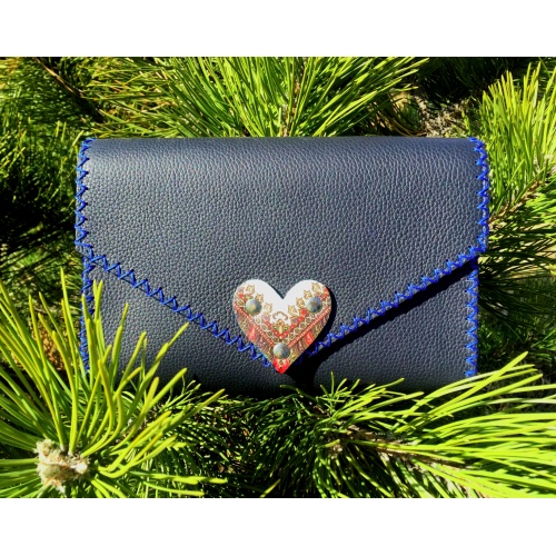 Geanta din piele naturala neagra, cu detaliu in forma de inima din piele naturala cu print traditional, cusuta manual (are captuseala, tot din piele naturala, este intarita cu salpa, se inchide cu capsa magnetica si este prevazuta cu curea asortata). Dimensiuni: 22cm/14cm/7cm. Produs unicat, made in Romania.