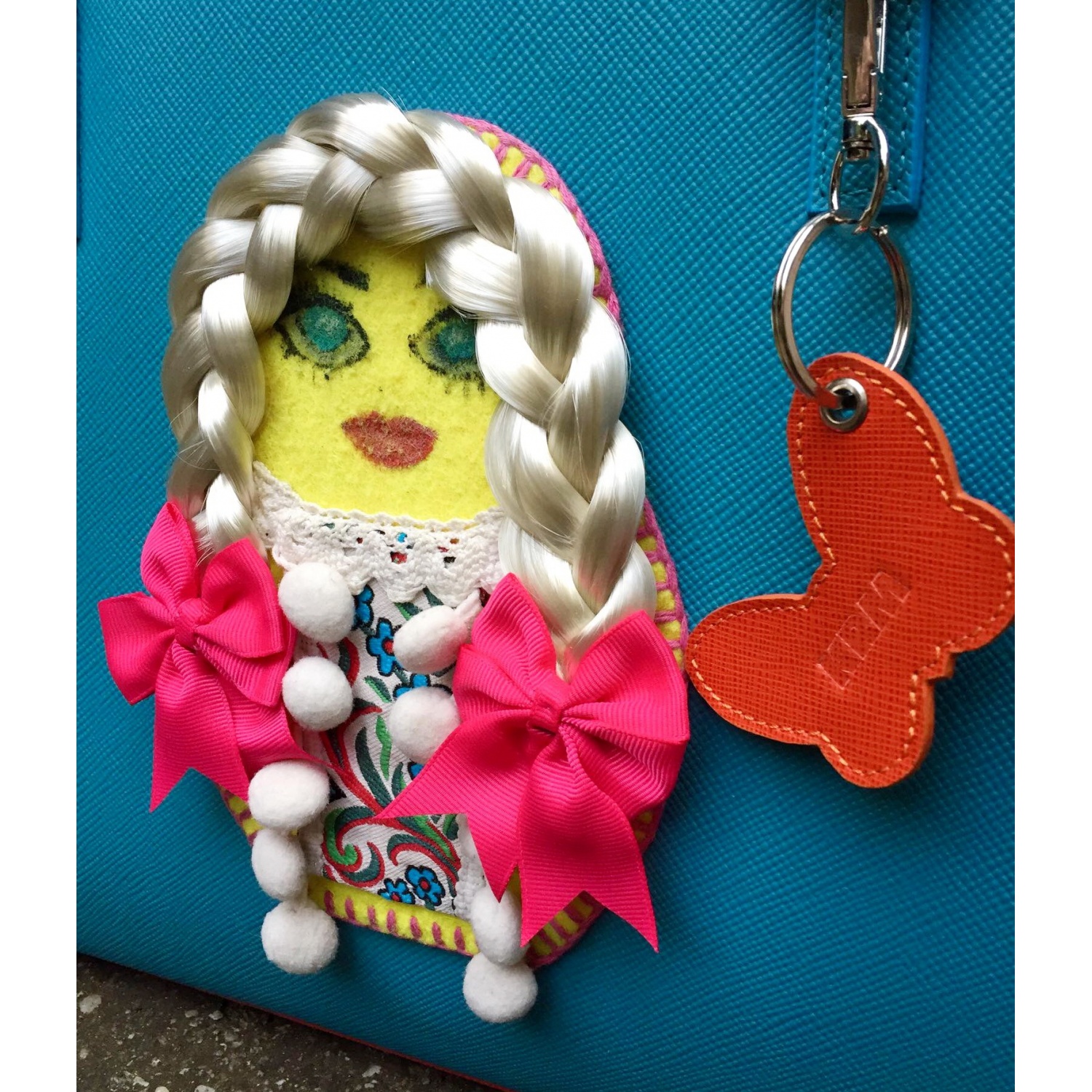 Unique Handmade Matrioshka Long Hair Doll On Turquoise and Orange Saffiano Leather Bag